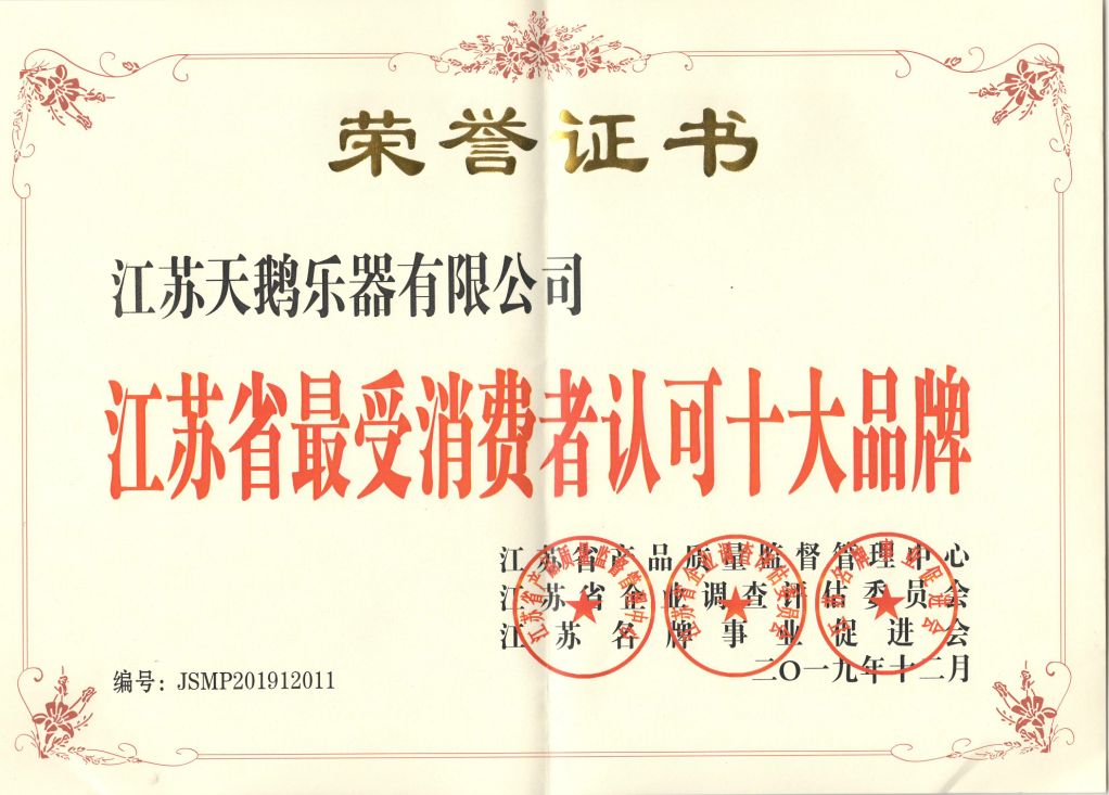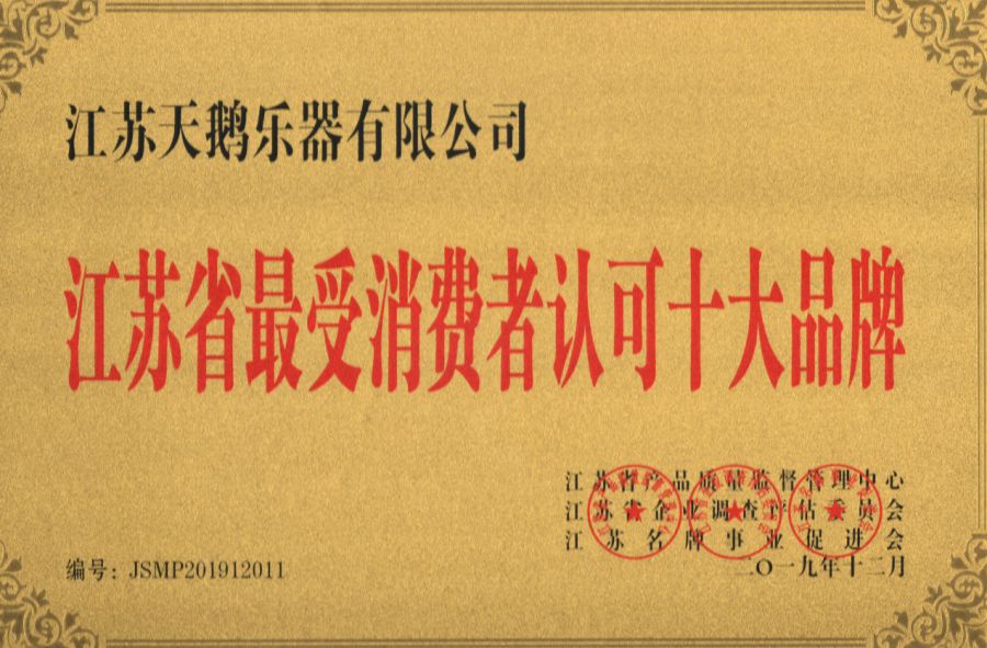 2019年12月,江蘇省產品質量監(jiān)督管理中心、江蘇省企業(yè)調查評估委員會、江蘇名牌事業(yè)促進會授予江蘇天鵝樂器有限公司“江蘇省最受消費者認可十大品牌”榮譽,并授予陳紅梅董事長“江蘇省誠信女企業(yè)家”稱號。