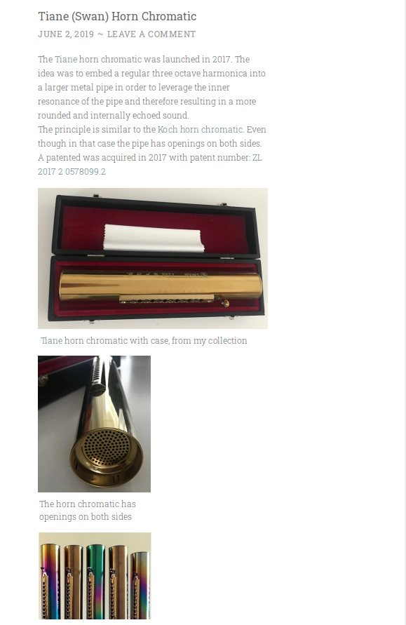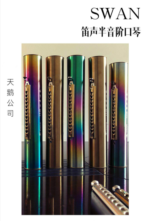 2017年天鵝推出了笛聲口琴,這個(gè)原理是將三個(gè)八度口琴嵌入到一個(gè)更大的金屬管中,以利用管道的內(nèi)部共振,從而產(chǎn)生更圓潤(rùn)和有內(nèi)部回聲的聲音。原理類(lèi)似Koch horn chromatic。即使在這種情況下,管道兩邊都有開(kāi)口。這款笛聲口琴在2017年獲得實(shí)用新型專(zhuān)利,專(zhuān)利號(hào)為:ZL201720578099.2。