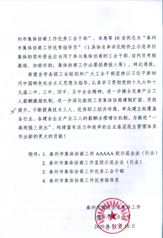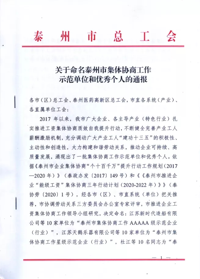 多年以來,天鵝樂器始終堅(jiān)持工資集體協(xié)商,不斷健全完善工人薪酬激勵(lì)機(jī)制,致力于調(diào)動(dòng)工人的積極性、主動(dòng)性和創(chuàng)造性,大力構(gòu)建和諧勞動(dòng)關(guān)系,推動(dòng)企業(yè)的可持續(xù)發(fā)展、高質(zhì)量發(fā)展。2020年11月,泰州市總工會(huì)、泰州市人力資源和社會(huì)保障局、泰州市工業(yè)和信息化局、泰州市工商業(yè)聯(lián)合會(huì)聯(lián)合授予天鵝樂器“泰州市集體協(xié)商工作星級(jí)示范企業(yè)(行業(yè))”稱號(hào)。