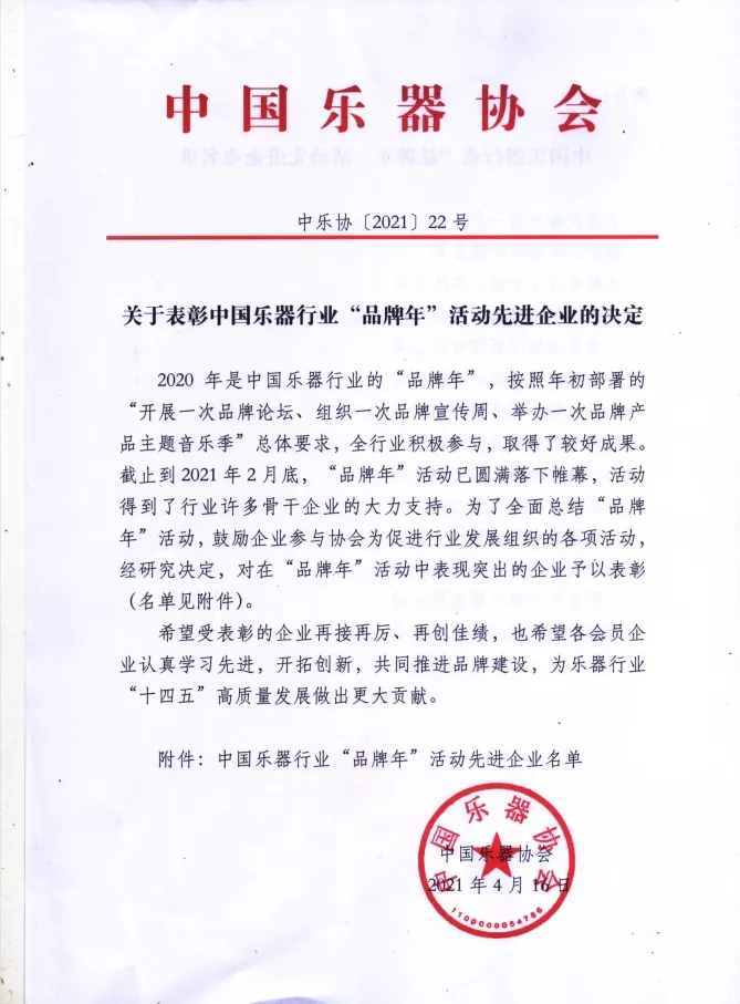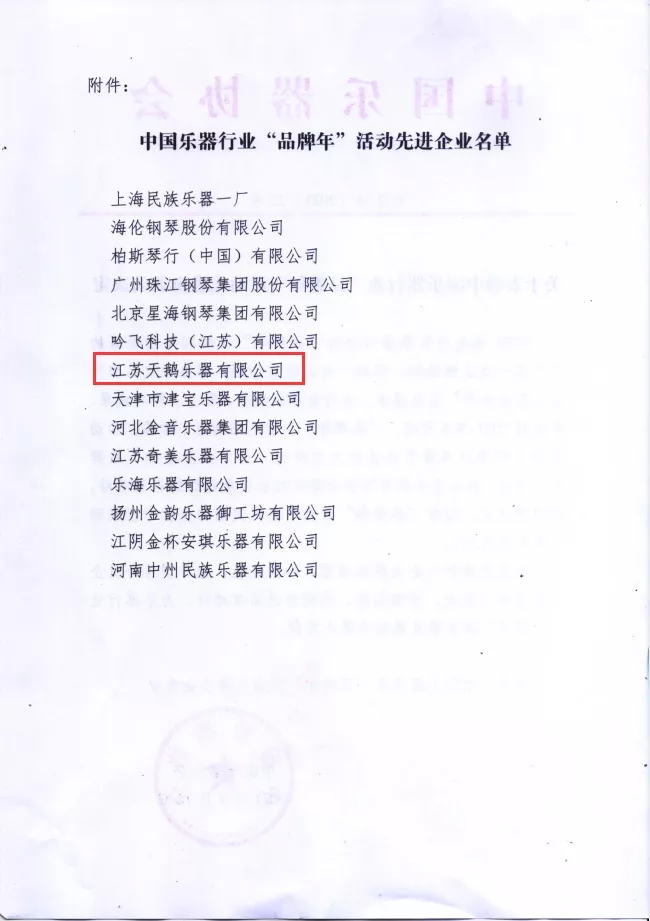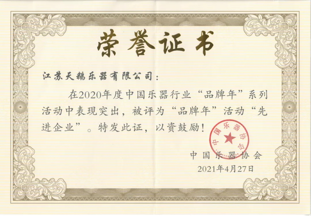 4月27日下午,在中國樂器協(xié)會八屆二次理事(擴大)會議暨八屆二次常務(wù)理事會議上,天鵝樂器獲得中國樂器行業(yè)“品牌年”活動“先進企業(yè)”榮譽。