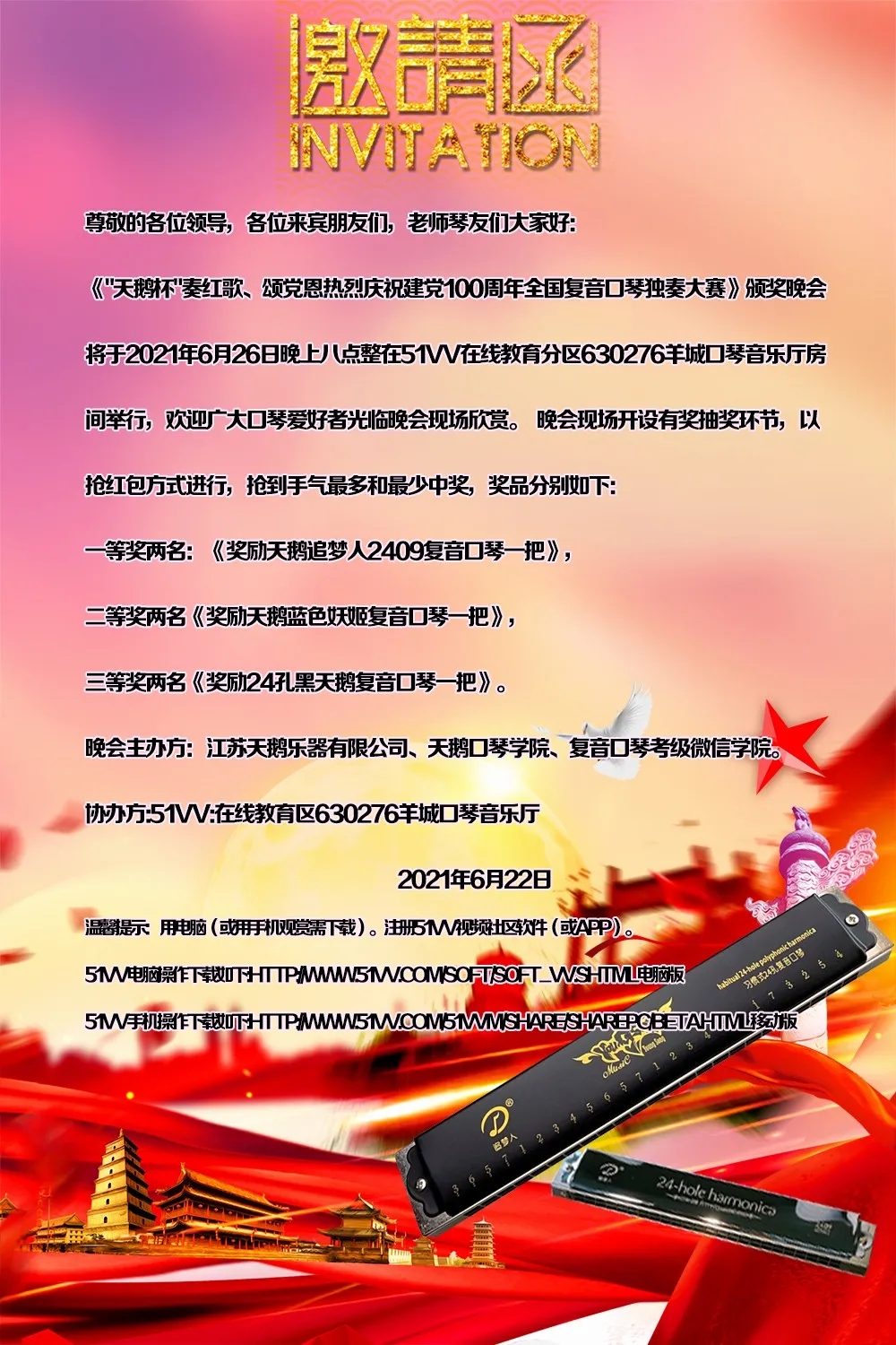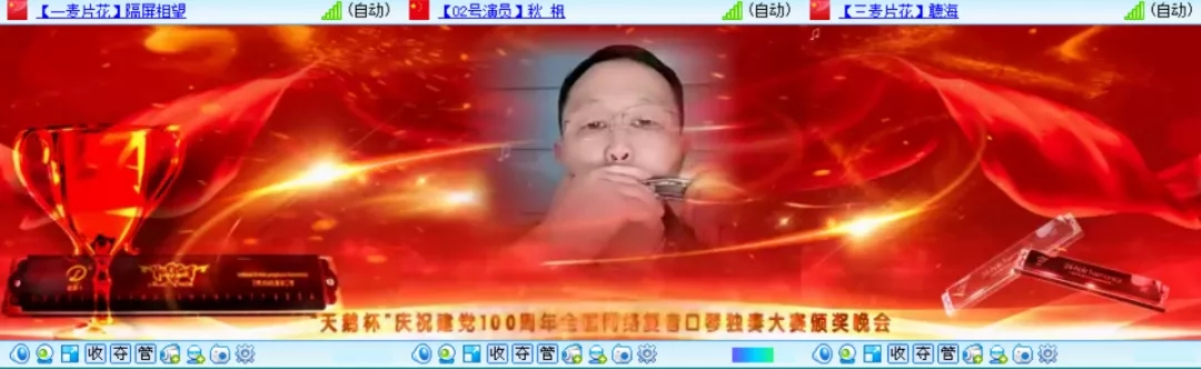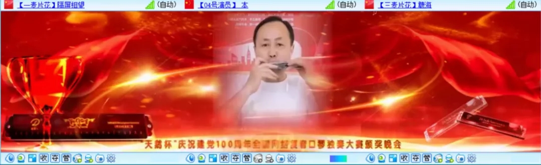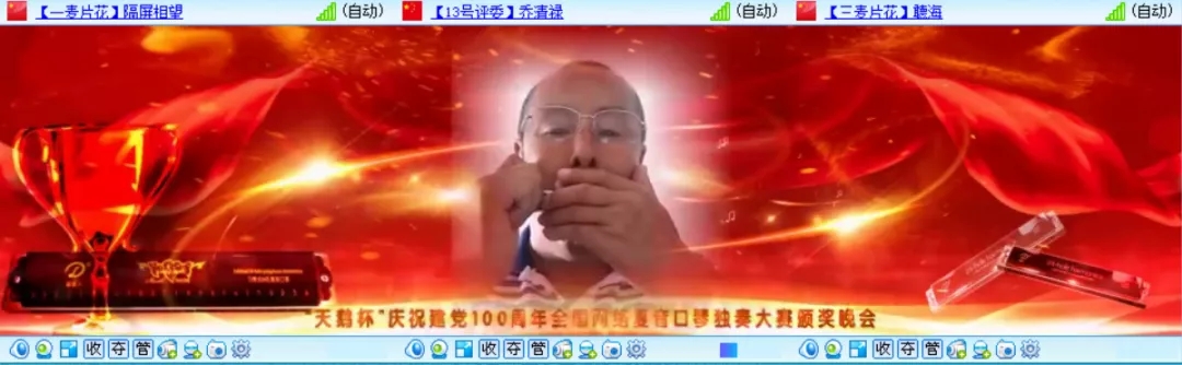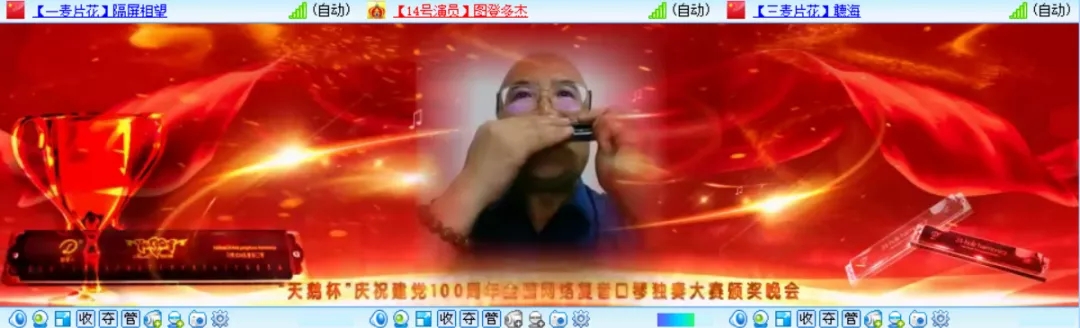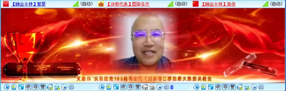 為熱烈慶祝建黨100周年,全國復(fù)音口琴獨(dú)奏大賽于2021年4月20日至6月30日在各口琴網(wǎng)絡(luò)群成功舉辦,歷時(shí)二個(gè)月時(shí)間,現(xiàn)已圓滿結(jié)束。6月26日晚八點(diǎn),“天鵝杯”慶祝建黨100周年全國網(wǎng)絡(luò)復(fù)音口琴獨(dú)奏大賽頒獎(jiǎng)晚會(huì)在51VV視頻社區(qū)舉辦。