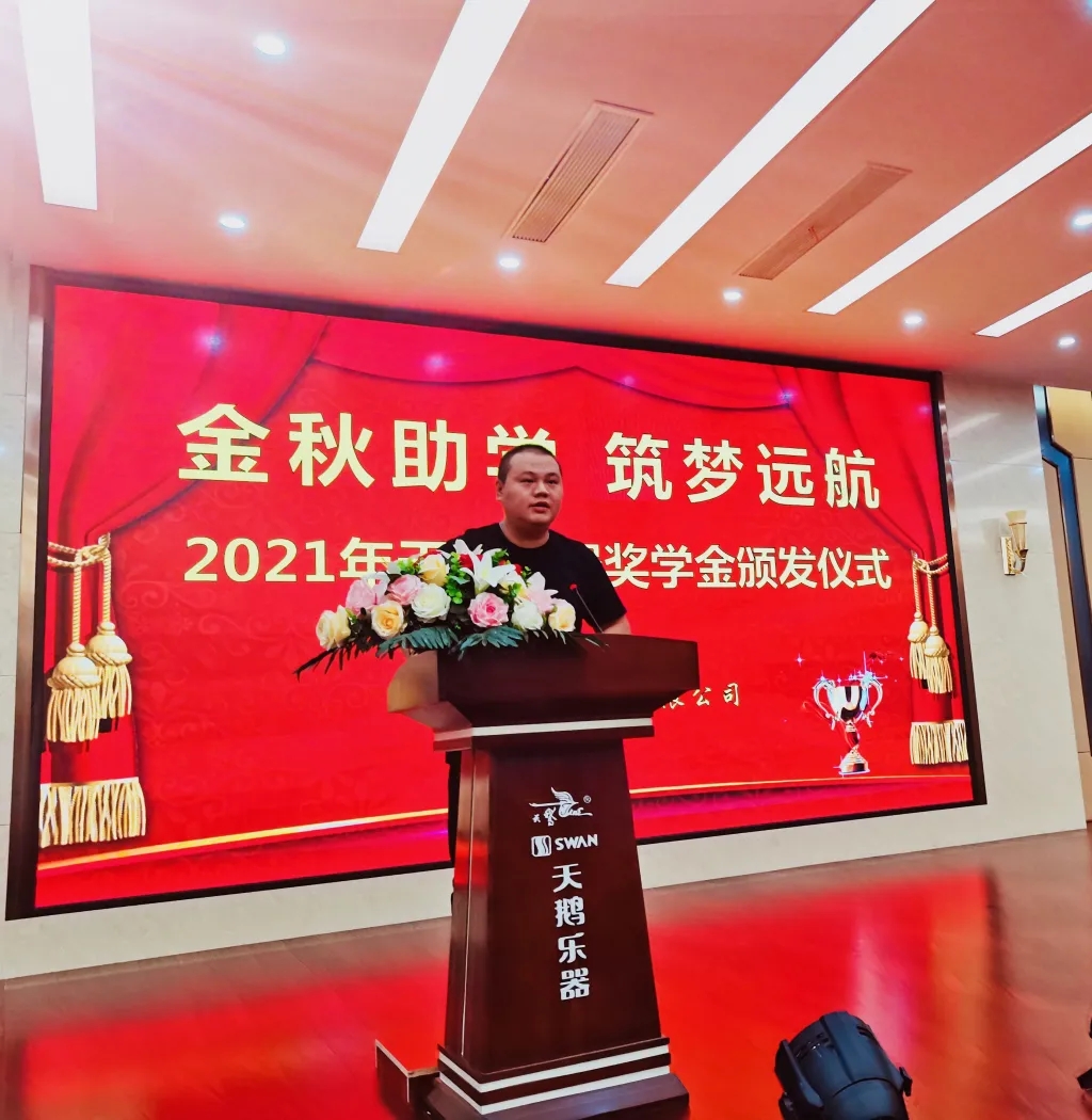 初秋八月,秋風(fēng)送暖。8月27日上午,在天鵝多功能廳舉行了2021年度“天鵝獎(jiǎng)學(xué)金”頒發(fā)儀式,公司總經(jīng)理陳滔致賀詞。