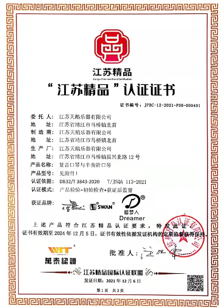 天鵝樂器通過“江蘇精品”認(rèn)證